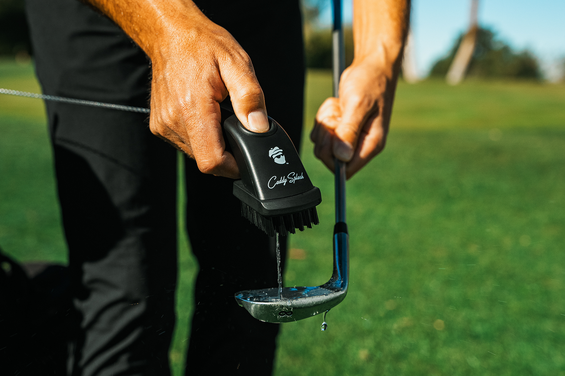 Caddy Splashのウォーターブラシは、ブラシとボトルが一体構造になっているので、適量の水を出すことができます。ラウンド中も、フェースに付着した汚れをブラッシングと水洗いで簡単に落とせるので、大変便利です。