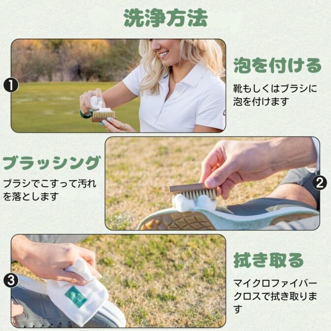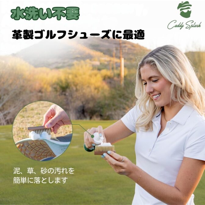 しっかりとした毛先でありながら、やさしい肌触りのブラシは、革製のゴルフシューズやスニーカーに傷を付けること無く汚れを落とします。
