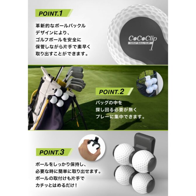 ■COCO CLIP(ココ クリップ)は、取り外し可能な背面クリップ付きのゴルフボールホルダーです。革新的なボールバックルデザインにより、ゴルフボールを安全に保管しながら片手で素早く取り出すことができます。