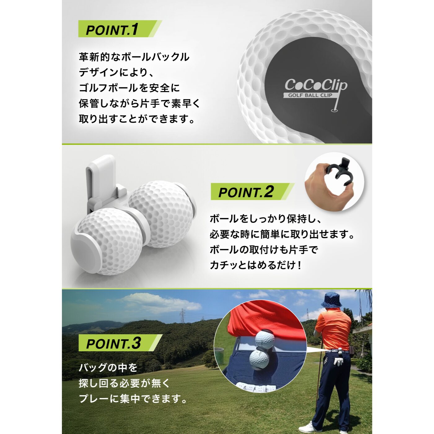 ■COCO CLIP(ココ クリップ)は、取り外し可能な背面クリップ付きのゴルフボールホルダーです。革新的なボールバックルデザインにより、ゴルフボールを安全に保管しながら片手で素早く取り出すことができます。